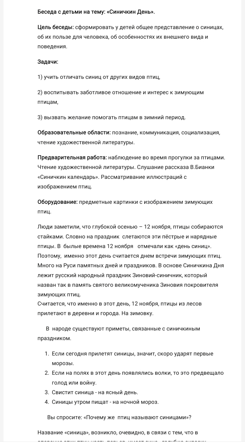 Беседа на тему: " Синичкин день "